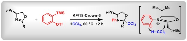 (8) Benzyne-mediated trichloromethylation of chiral oxazolines. Xin Huang,+Weizhao Zhao,+ De-Li Chen, Yaling Zhan, TingtingZeng, Huiquan Jin, Bo Peng*Chem. Commun., 2019, 55, 2070.