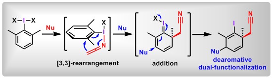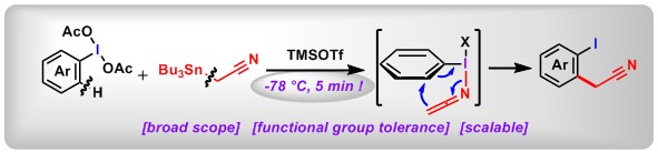 (13) Selective ortho C-H Cyanoalkylation of (Diacetoxyiodo)arenes via [3,3]-Sigmatropic Rearrangement. Junsong Tian, Fan Luo,+ Chaoshen Zhang,+ Xin Huang,* Yage Zhang, Lei Zhang, Lichun Kong, Xiaochun Hu, Zhi-Xiang Wang*, Bo Peng* Angew. Chem. Int. Ed.2018, 57, 9078.
