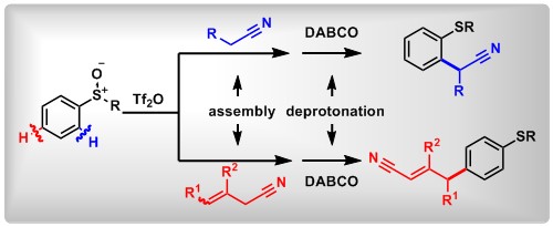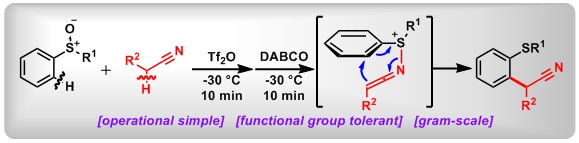 (12) Redox-Neutral α-Arylation of Alkyl Nitriles with Aryl Sulfoxides: A Rapid Electrophilic Rearrangement. Li Shang,+ Yonghui Chang,+ Fan Luo, Jia-Ni He, Xin Huang, Lei Zhang, Lichun Kong, Kaixiao Li, Bo Peng* J. Am. Chem. Soc., 2017, 139, 4211. (Highlighted by Synform 2017/07, A112–A114 and X-mol).