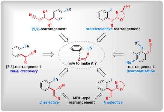 本课题组致力于有机反应方法学的开发,并努力推动新兴的有机反应在药物中间体以及功能材料中的应用。目前,课题组主要研究重排反应,特别是借助高价硫/碘化合物构建不稳定的重排前体,发展传统重排难以实现的重排过程。
