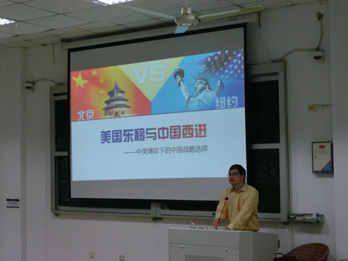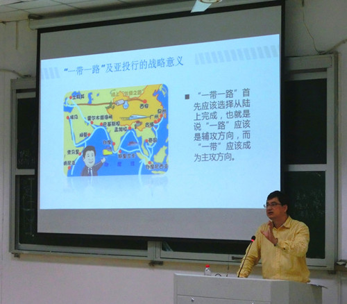 18点30分,本期培训班迎来了课程的第一讲。本次授课由校党委委员、校党委宣传部部长朱坚老师主讲“美国东移与中国西进”。他从历史上第一个金融帝国的出现说起,阐述了美元指数周期律与全球经济的关系,并从中国周边形势与美元指数周期、中国快速兴起动了谁的奶酪、“一带一路”及亚投行的战略意义三个方面进行解读与剖析,深入浅出地讲解了中美博弈下的中国战略选择。