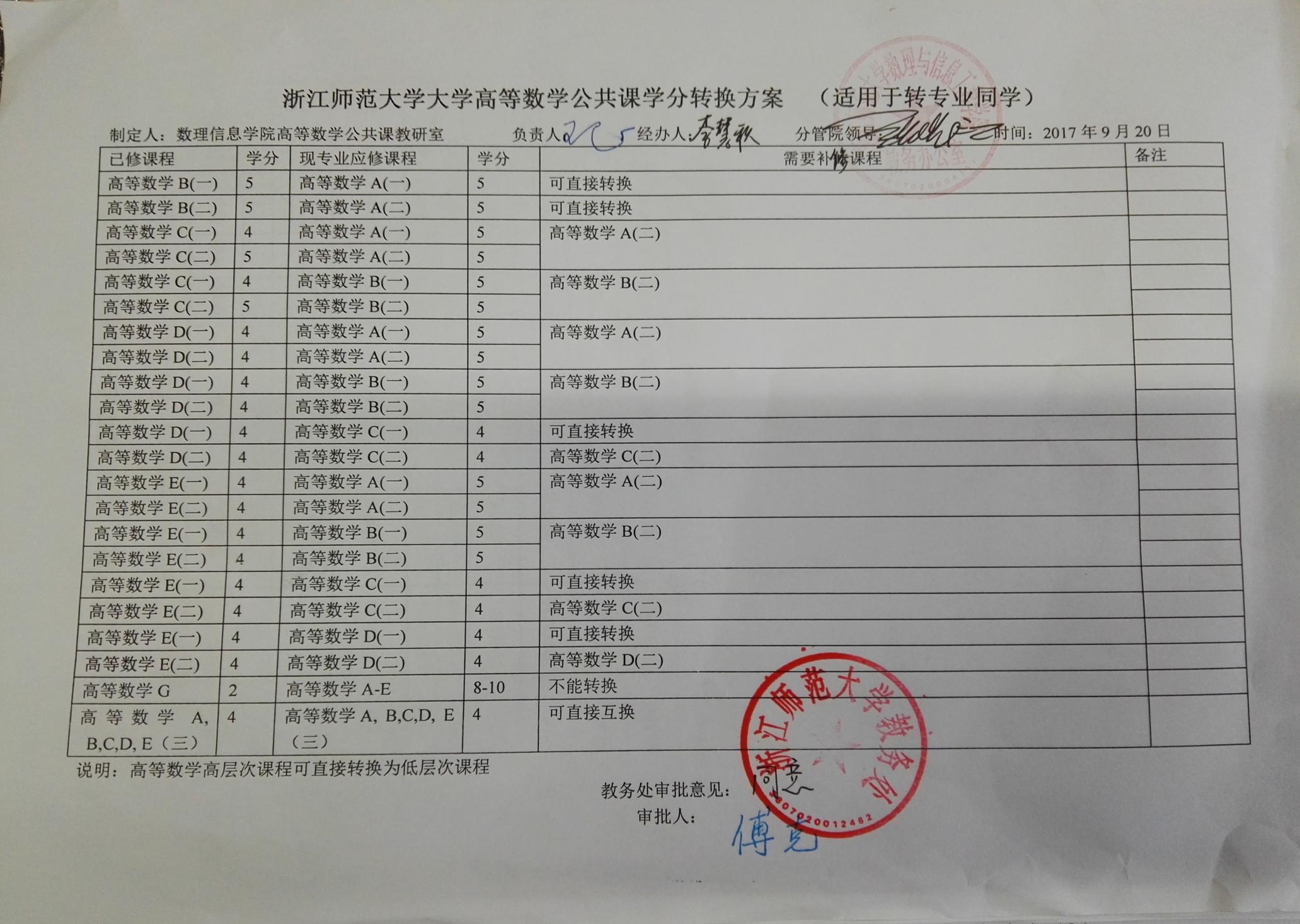 浙江师范大学校内学分转换登记表(学院) 经办人