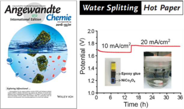 [1]Xuehui Gao?, Hongxiu Zhang?, Quanguo Li, Xuegong Yu, Zhanglian Hong, Xingwang Zhang*, Chengdu Liang, Zhan Lin*, Hierarchical NiCo2O4 hollow microcuboids as bifunctional electrocatalysts for overall water‐splitting. Angew.Chem.Int. Ed. 2016, 55,6290-6294.(Hot Paper, Inside cover) (ESI Highly Cited Paper 1%)