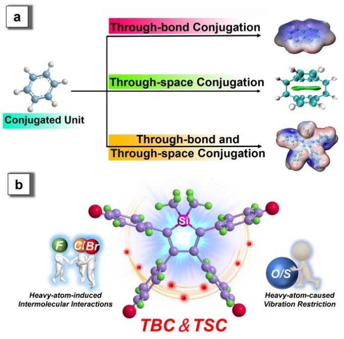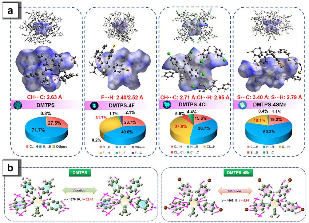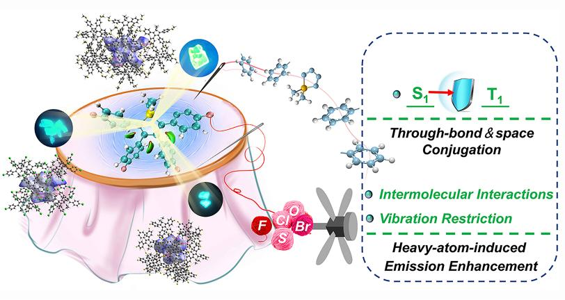 钱兆生、丰慧教授团队针对这两大问题,首先基于理论研究将所有发光分子从共轭结构上进行清晰的划分,阐明了聚集诱导发光分子中贯穿空间共轭的定义。理论证明,重原子在该类分子中无法有效促进自旋轨道耦合(SOC)以及减少S1到T1之间的能差,这意味着重原子效应在贯穿空间共轭类AIE分子中存在一定的不适用性。与此同时,重原子引入所带来的弱作用力以及重原子诱导振动受限协同作用促进了荧光强度的提升。