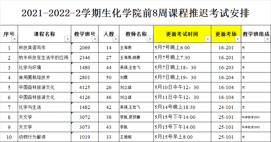 关于2021-2022-2学期生化学院前8周课程推迟考试安排现予公布。如有问题,请在考前三天及时反馈任课老师。