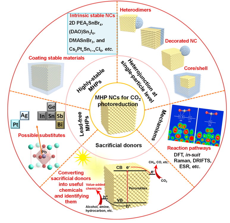 利用太阳能将CO2转化为高附加值的化学燃料被认为是解决温室效应和能源危机的有效途径。钙钛矿纳米晶因其具有可调的带隙、低激子结合能、高消光系数等优良的光电特性,被认为是光催化CO2转化的理想催化剂。然而,钙钛矿光催化剂在实际应用中面临着稳定性较低和载流子复合严重的问题。近年来,针对上述问题,研究人员发展了不同的策略和方法改性钙钛矿光催化剂,但对于如何合理设计钙钛矿光催化剂等问题仍然缺少系统的研究。