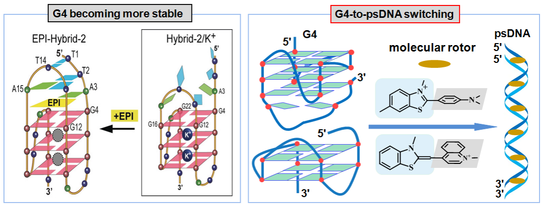 G-Quadruplex(G4)是近年来最受关注的非经典核酸结构,其稳定性及结构开关转换在疾病发生发展、靶向药物设计、新型传感器构建、生物催化等方面具有重要研究价值。目前国际上研究较多的是发展小分子配体(或药物前体),与G4结合多为单分子结合,以稳定G4结构,或使G4从一种构象转变为另一种构象。最近也意识到使G4转变为非G4结构的开关策略也具有同等的重要性。然而单分子结合很难实现这种G4结构开关,尤其在体液条件下如何实现开关依然面临挑战。