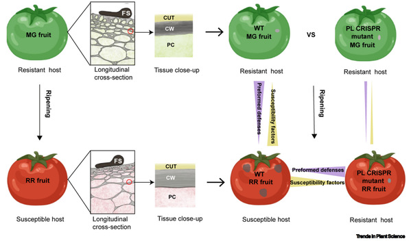 作为植物细胞的最外层结构,细胞壁不仅参与植物生长发育,形态建成,也是病原菌入侵植物的第一道防御体系。在病原菌入侵宿主细胞的过程中细胞壁结构完整性受到破坏,而植物在感知细胞壁损伤后,通常会激发一系列的防御反应,包括植物细胞壁组分和结构的重塑。随着近年来对植物细胞壁模型和果胶的重新审视,果胶被认为维持细胞壁机械性能和细胞壁完整性的重要组成成分,在病原菌感知和防御反应的激活方面起着至关重要的作用。该论文总结了近年来有关果胶调控植物免疫的最新研究进展,构建了果胶调节植物免疫的调控网络图。并进一步以番茄果实为模型,阐释了果实软化过程细胞壁代谢特点以及细胞壁完整性如何影响和调控果实抗病性。论文提出了独到的见解与未来重要的研究方向,为植物响应病原菌胁迫的研究领域提供了新的视角。