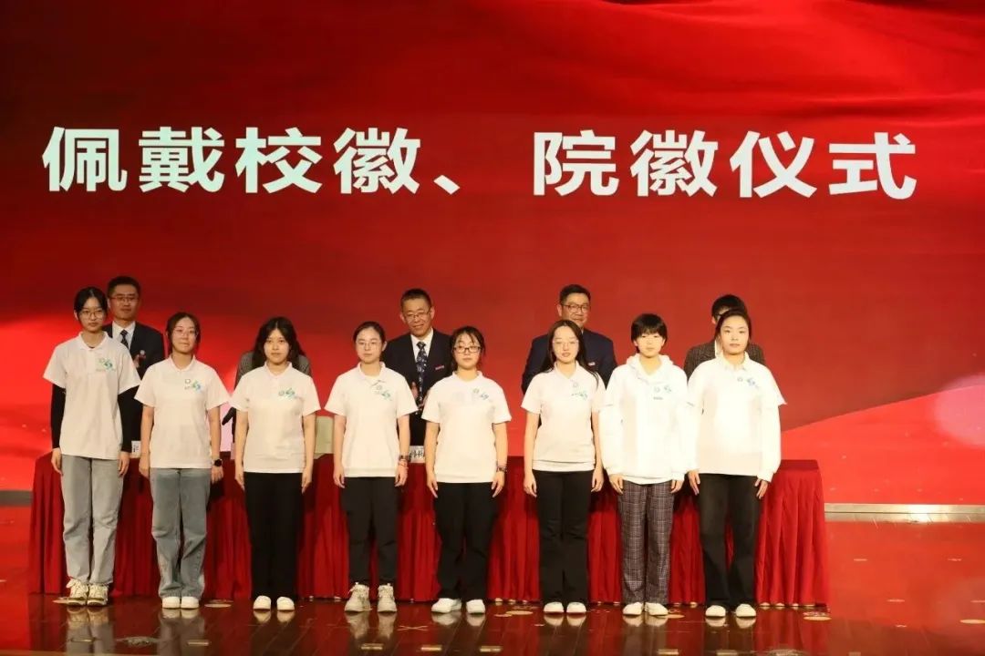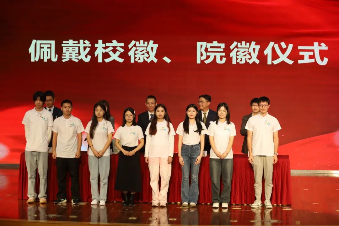 在激昂的音乐中,学院领导为新生代表佩戴校徽、院徽。凝结着学校、学院精神的校徽、院徽,别在胸前,更刻在心间。