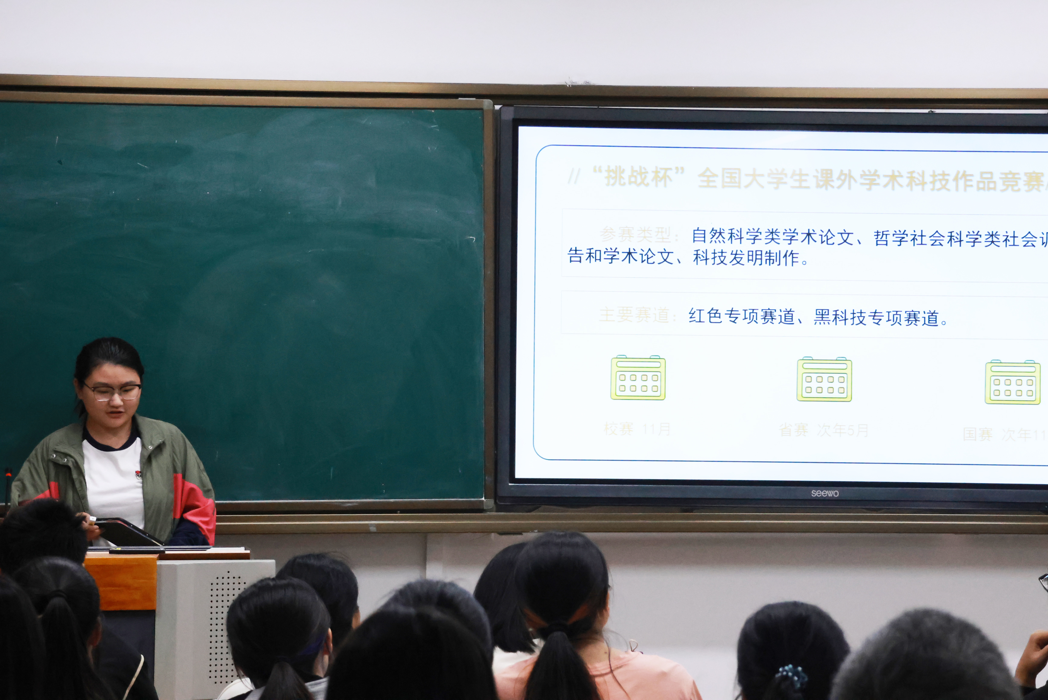 范欣悦对生科院学生主要参与的学科竞赛进行了概括总结,从类型、组别、赛道、时间、申报条件等多方面详细介绍了“互联网+”大学生创新创业大赛、“挑战杯”系列赛事、生命科学竞赛、环境生态科技创新大赛等比赛。