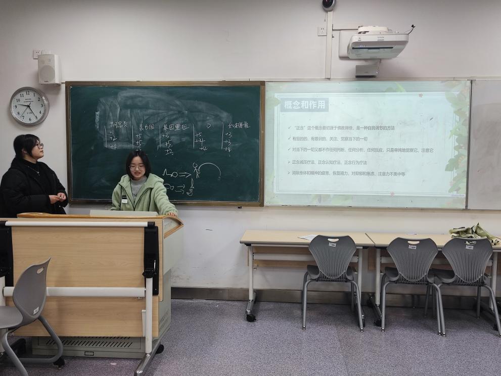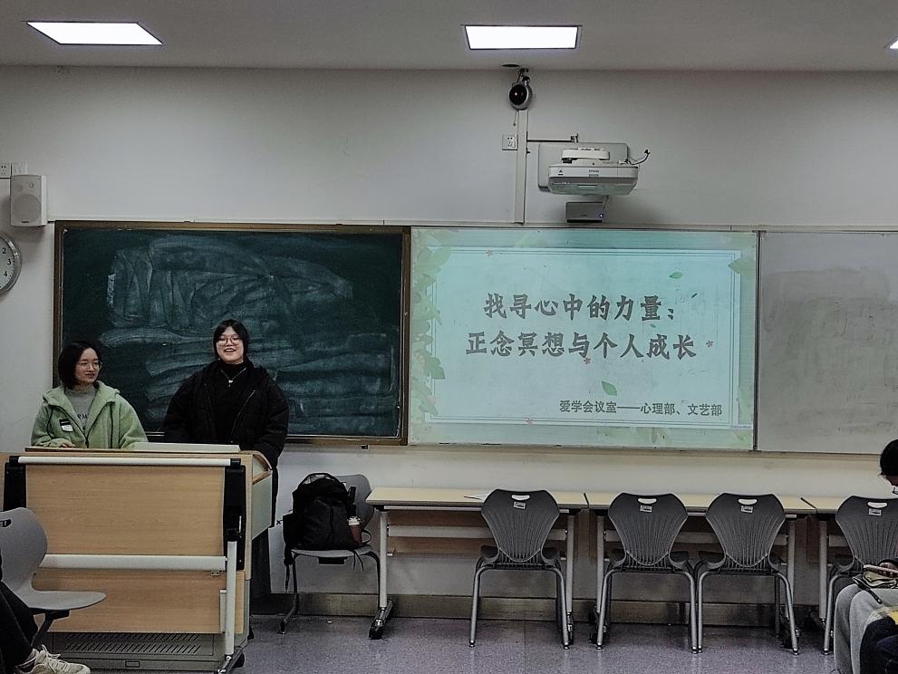 12月16日晚,浙江多多28团委学生会文艺部、心理部联合举办“找寻心中的力量:正念冥想与个人成长”主题爱学会议室活动。文艺部副部徐沁和心理部副部曹瀚丹主持本次活动。