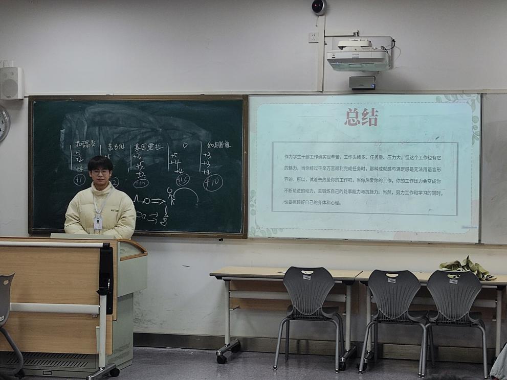 心理部部长杨帅分享了平衡学习和工作的方法,讲述了如何与压力和平相处。他认为作为一名学生干部,虽然会面临任务重、压力大的难题,但这个工作也有它的魅力。当你历经千辛万苦完成工作时,自豪感与成就感不言而喻。因此,他呼吁同学们热爱自己的工作,照顾好自己的身心健康的同时,锻炼自己处事与抗压的能力。