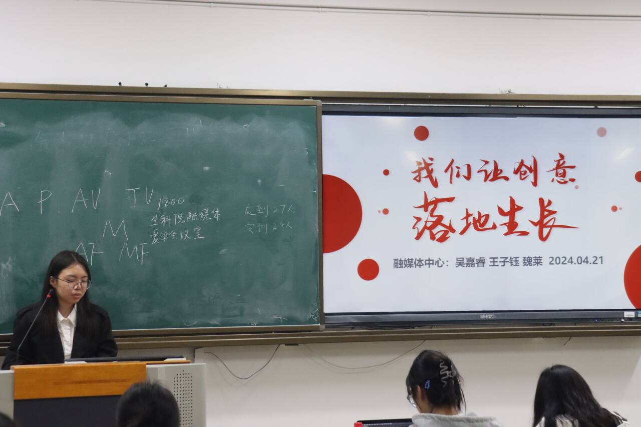 为了激发同学们的创作热情,感受融媒新魅力,并提高同学们对文字与影像的把控能力,421日晚,浙江多多28融媒体中心16106室开展了以“我们让创意落地生长”为主题的爱学会议室。融媒体中心新闻部吴嘉睿、摄制部王子钰、设计部魏莱共同主持了本次活动。