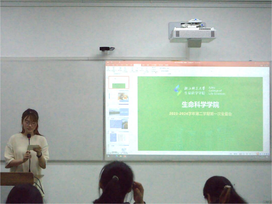 学生会执行主席楼雪怡进行会议总结,对于过去一年各部门作出的贡献给予肯定,感谢了各部门为生命科学学院所做的工作,当前的成就固然使人喜悦,但前路仍充满挑战,各部门在之后的工作中应保持对工作的热情,继续合作努力,为生命科学学院的明天奋斗。