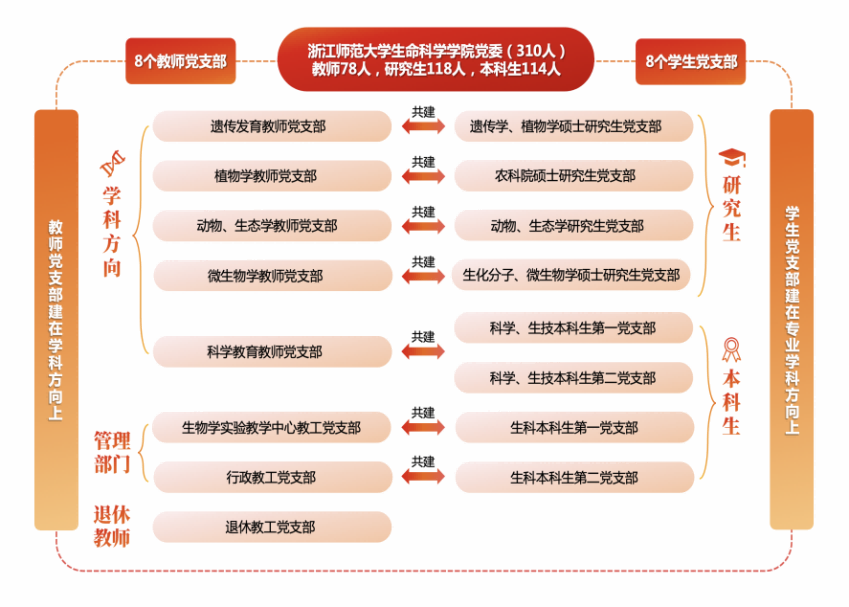 生命科学学院党委深入学习贯彻习近平新时代中国特色社会主义思想,坚持以政治建设为统领,以立德树人为根本,以学科建设为引领,以队伍建设为重点,以深化改革为动力,以提升社会服务能力为突破口,构建“五位一体”的党建“1+1”工程,实施“教师-研究生-本科生”党支部“三结对”,构建“组织联建、活动联办、资源联用、服务联结”的师生党支部“四联共建”育人体系,实现党建事业共融互促,以高质量党建引领高质量发展,以高质量发展检验和评价高质量党建。