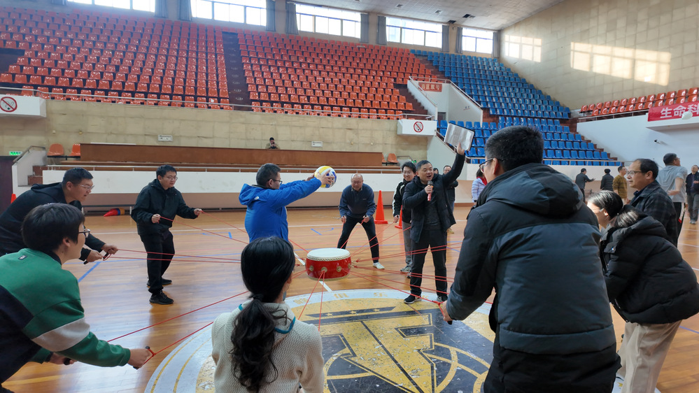 鼓舞飞扬项目中,老师们围在同心鼓四周,齐心协力地控制着鼓面的颠球节奏。他们目光坚定,口中喊着整齐的口号,让球在空中划出一道道美丽的弧线,彰显出高度的协作能力和团队凝聚力。