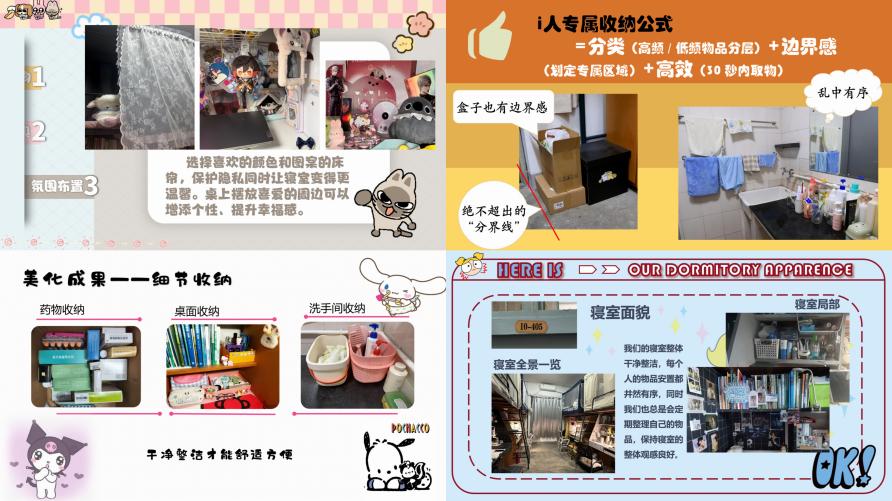 “寓”见美好 一见钟“寝”,初阳E1-215寝室介绍了她们的青春小窝日记,并且从桌面衣物收纳以及合理利用空间三方面分享了她们的收纳心得,还展示了她们的寝室公约以及寝室文化内涵:卫生、安全、学风。
