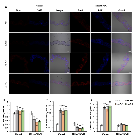 同时,TUNEL实验显示,oskea1的功能丧失会导致水稻盐胁迫下的DNA受损加剧,并且DNA修复和复制的功能紊乱。该研究揭示了水稻应对盐胁迫的适应性机制,同时暗示了OsKEA1作为耐盐遗传改良的关键靶点,为培育高抗盐水稻品种提供理论支撑。
