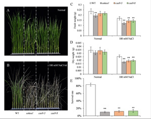 该研究从粳稻武运粳7号为背景的突变体库中筛选到一个盐敏感的水稻突变体oskea1,该突变体在盐胁迫下叶片枯萎卷曲,存活率降低。