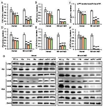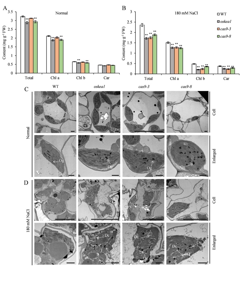 高盐离子影响植物叶绿体的超微结构,导致叶肉细胞肿胀。透射电镜分析显示,oskea1功能丧失突变体在盐胁迫下的叶绿体减少且形态异常,类囊体排列松散,嗜锇颗粒增多。WB分析显示,突变体光系统相关蛋白积累减少,光系统被破坏。