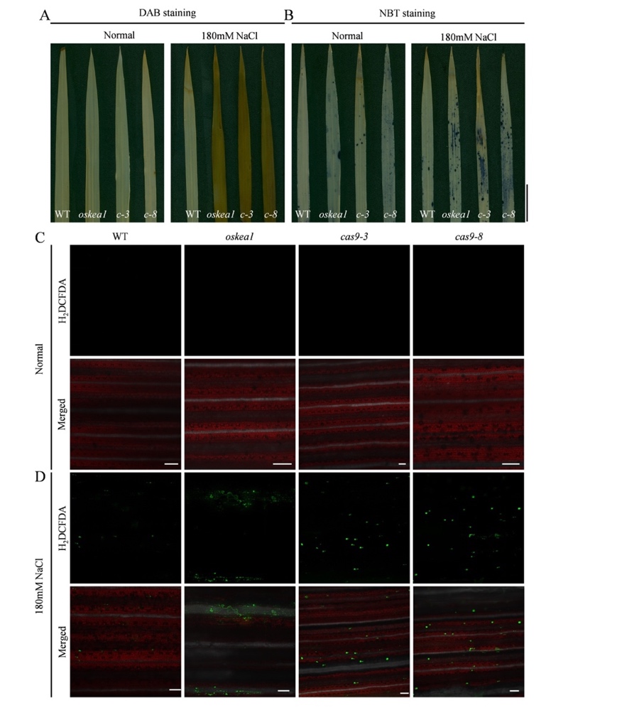 组织化学染色和H2DCFDA探针标记显示,oskea1功能丧失突变体在盐胁迫下的ROS含量积累。