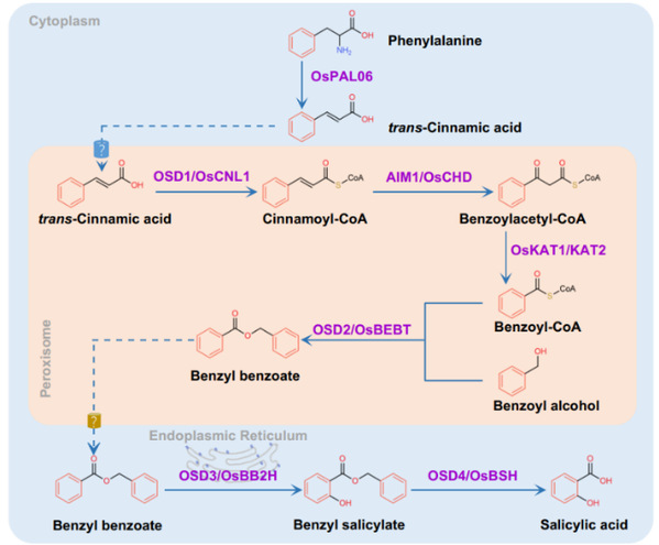 在获得以上遗传学材料基础上,将PAL依赖SA生物合成过程分解为由肉桂酸(CA)合成BA-CoA的β-氧化过程以及由BA-CoA合成SA的两个生化过程,进一步通过分子生物学、生物化学等方法阐明SA 代谢路径。结果表明:在过氧化物酶体中,肉桂酸经(CA)β-氧化途径,由肉桂酰辅酶A连接酶OSD1、肉桂酰辅酶A氢化酶/脱氢酶AIM1、3-酮脂酰辅酶A硫解酶OsKAT1/KAT2酶的依次催化下生成BA-CoA;随后,BA-CoA在苯甲酰转移酶OSD2的作用下生成苯甲酸苄酯(BB),BB从过氧化物酶体转运到细胞质中,经在内质网定位的BB 2-羟化酶(BB2H)OSD3催化生成水杨酸苄酯(BS),最后在胞质中由BS水解酶(BSH) OSD4催化生成SA(图1)。值得注意的是,本研究揭示了BA不能直接转化生成SA,而是由β-氧化产物BA-CoA 与苯甲醇反应生成苯甲酸苄酯(BB),再通过BB 2-羟基化酶(BB2H OSD3)催化生成水杨酸苄酯(BS),最后通过BS水解酶(BSH)水解生成SA。以上发现颠覆了1962年在nature提出SA由BA催化合成以及1995年在PNAS提出的BA2H催化BA合成SA的传统认知。