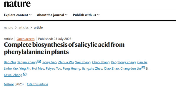 当地时间7月23日,Nature最新一期刊发我院张可伟教授团队的最新研究成果“Complete biosynthesis of salicylic acid from phenylalanine in plants”。该成果首次完整阐述了水稻苯丙氨酸解氨酶(PAL)依赖的水杨酸(SA)生物合成途径,关键酶的亚细胞定位和分子进化。为利用分子育种技术培育作物抗病新品种提供了重要基因靶标。