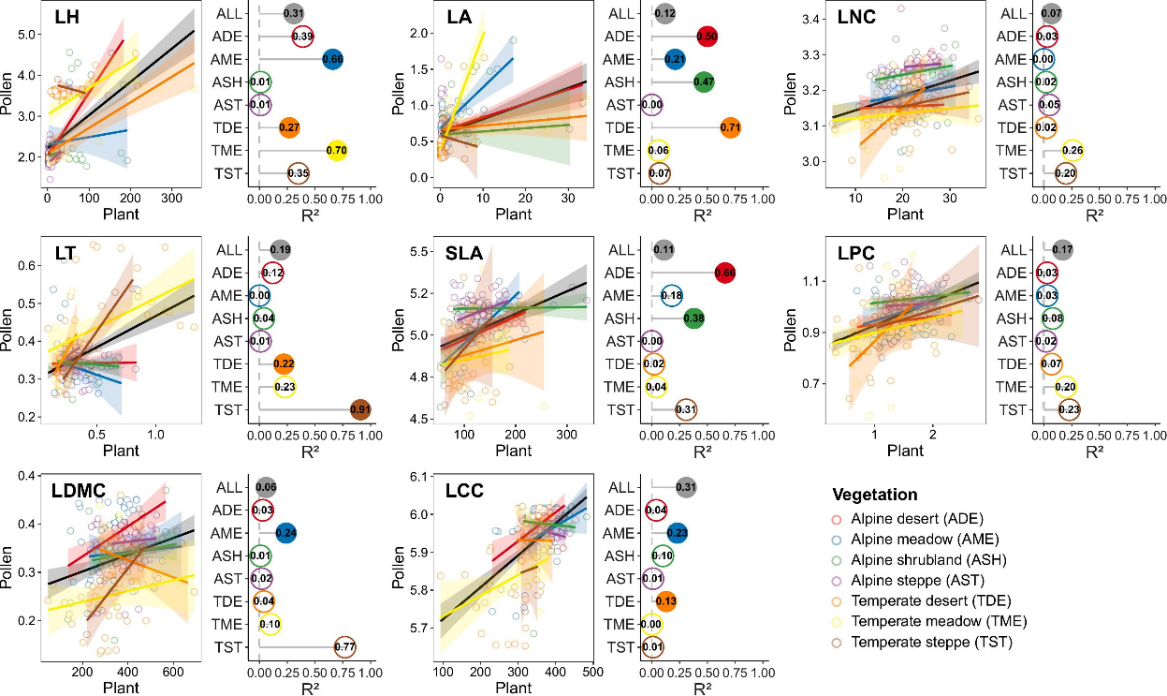 图3. 基于孢粉和样方调查的植物功能性状群落加群平均对比:Liao MN, Jin YL, Li K*, Ni J*. 2025. Functional traits from pollen and plant assemblages show complex relationships on the Tibetan Plateau: a deep insight into trait paleoecology. Global and Planetary Change, 254: 105031. https://doi.org/10.1016/j.gloplacha.2025.105031